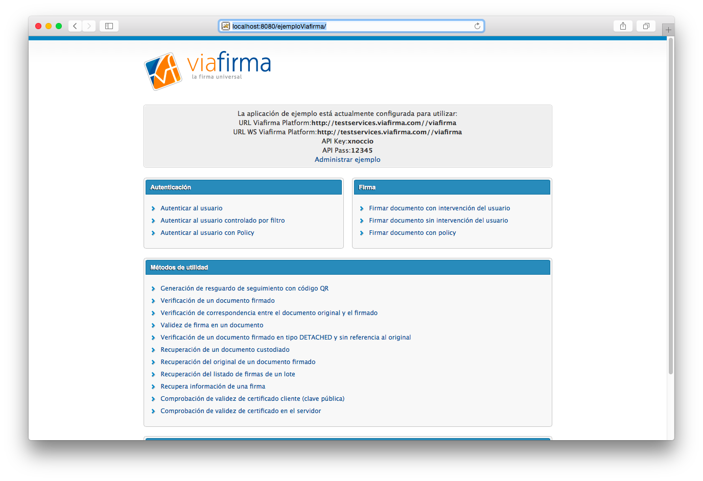 En esta pantalla ya se podrán realizar las diferentes pruebas para el correcto funcionamiento de la plataforma (autenticación, firmas en cliente, firmas en servidor, policies etc.).
