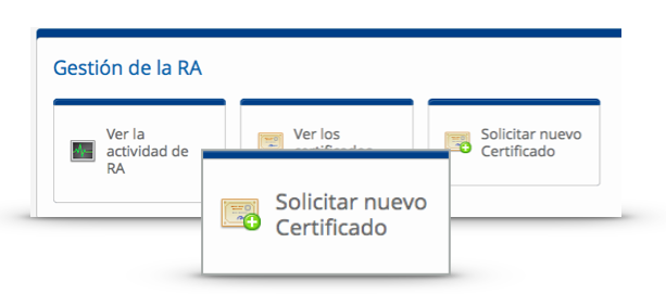 Sin embargo, en ocasiones es necesario completar el proceso de solicitud desde la parte privada, de manera supervisada por un registrador de la RA. Para ello, en la Gestión de la RA, el registrador dispone de la herramienta Solicitar nuevo Certificado.