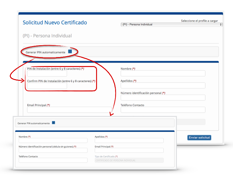 La segunda diferencia de este tipo de solicitud privada, está en la generación del PIN del certificado, necesario sólo para los casos de certificados exportados en formato .p12.