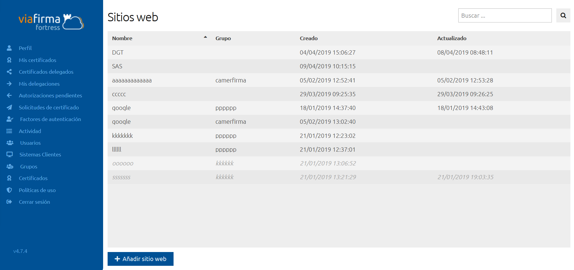 La página inicial de esta sección es el listado de sitios web, donde se mostrarán todos los nombres de los sitios web dados de alta en Viafirma Fortress, el grupo al que pertenece el sitio web, la fecha de creación y la fecha de modificación.